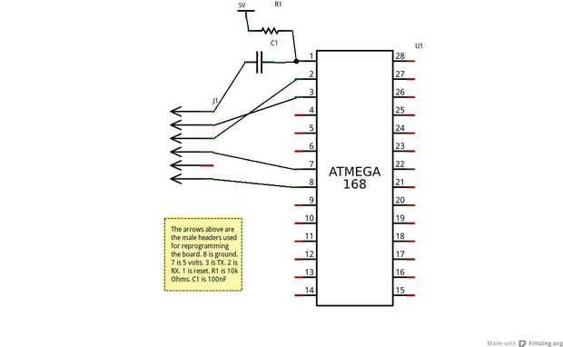 Cuadro 5 (pines de programación) Las flechas de arriba son cabeceras masculinos utilizados para la reprogramación de la Junta. 8 es tierra. 7 es de 5 volts. 3 es TX. 2 es RX. 1 se restablece. R1 es 10 k ohmios. C1 es de 100nF.