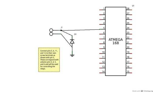 Cuadro 6 (pernos de relé) Conectar pines 5, 6, 11 y 12 para sus propios terminales como se muestra con el pin 5. Estos se corresponden con pines de arduino, 3, 4, 5 y 6 y se utilizará para el control de los relés.