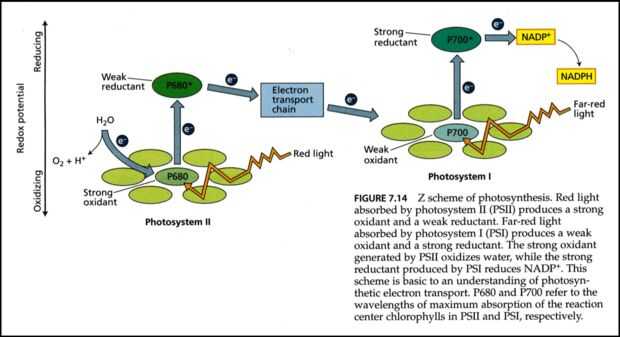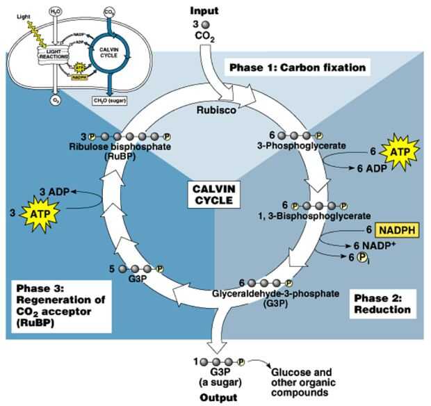 La fotosíntesis es cómo las plantas convierten la luz del sol en azúcares. La ecuación química es 6CO2 + 6H2O--> luz del sol--> C6H12O6 + 6O2. Fotosíntesis ocurre en dos etapas: la oscuridad y la luz. Primero es la etapa de luz que, como su nombre indica, se necesita la luz del sol. Lo que pasa es electrones son tomadas de la molécula de agua y excitó en fotosistema 2. Entonces los electrones son transportados por lo que se llama la cadena de transporte de electrones. Esta cadena es nada más una serie de reacciones de oxidación y reducción que bajar progresivamente los electrones en un estado menos excitado. Una vez que los electrones fotosistema 1 son excitado otra vez y bajar por otra cadena de transporte del electrón más pequeño. Mientras que los electrones pasan de un estado más excitado a un estado menos excitado también recurren una sustancia llamada NADP + (nicotinamida adenina dinucleótido fosfato) en NADPH. Se utiliza en la etapa oscura, también conocido como el ciclo de calvin. El Calvin Cycle es una serie de modificaciones a partir de una reacción con el inicio de la RuBP (ribulosa bifosfato) y dióxido de carbono utilizando una serie de enzimas y reacciones redox. Se llama un ciclo porque después de que el azúcar se produce la partida material RuBP se sintetiza otra vez. Para cada vuelta del ciclo del carbono hay salida derivado 1 azúcar y 3ATP (la fuente de energía de la vida). Por lo que toma 6 rondas de Calvin Cycle para crear una molécula de glucosa. Hay un montón de plantas que utilizan diferentes variaciones de este ciclo.