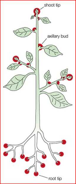 El tallo de la planta crece a partir de lo que se llama el coteledon en la semilla. Crecimiento Longitudal es iniciado por el meristemo apical, que es el brote de crecimiento primario. Meristemos laterales son responsables de la planta más grande en diámetro. Hay dos estructuras llamadas los brotes auxiliares que crecen a ambos lados del meristemo principal. En caso de que el brote axial se corta por alguna razón los alrededores auxiliar cogollos asumirán y cultivar la planta en una nueva dirección. Se trata de cómo podar redireccionar el crecimiento del árbol cortando algunas ramas.