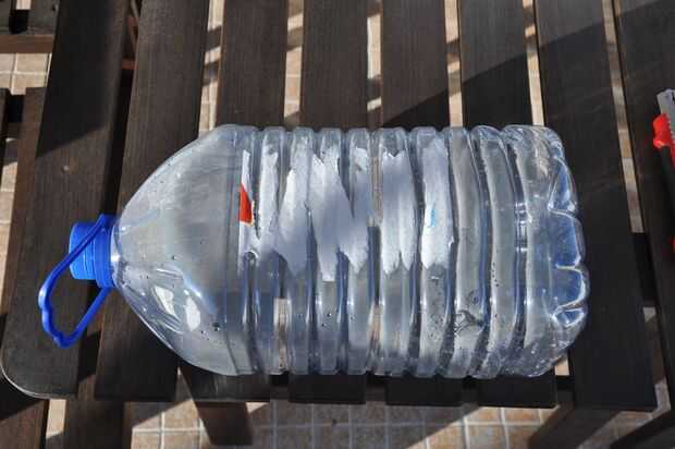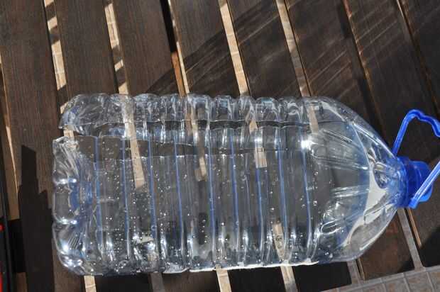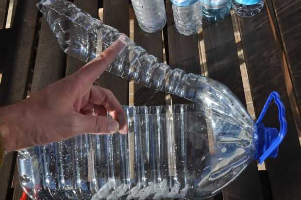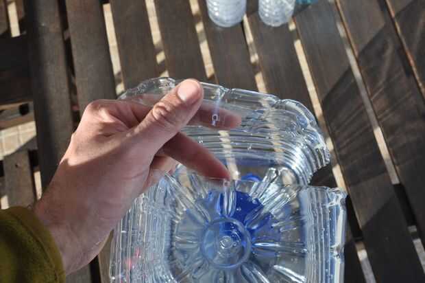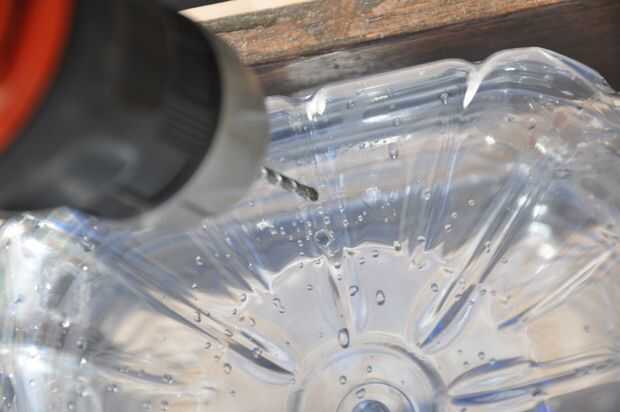 En una grande botellas de plástico, en el fondo eligió el lugar para perforar dos agujeros pequeños.