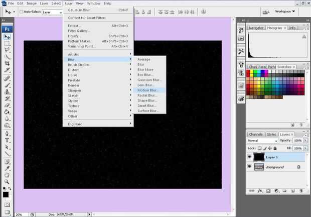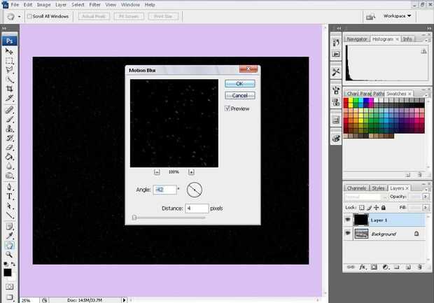 9. ir a filtro > Desenfoque > Desenfoque de movimiento para crear un cierto movimiento para la nieve.