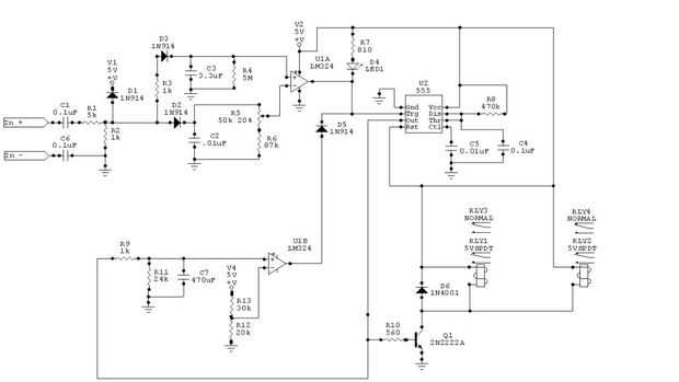 La salida del circuito de detección de pico activa un temporizador 555 (U2), que genera un pulso de 20 ms para los relés de flashes. El 555 la porción de circuito alrededor de U1B impide volver a accionar durante unos 5 segundos, esto permite que el tiempo de destellos recargar...