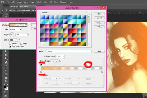 Ahora ir a capa - capa gradiente nuevo relleno. Cambiar el color de degradado a feb057 y hacer la opacidad como en la imagen de arriba. Cambiar opacidad de puntos 100% y 0%.