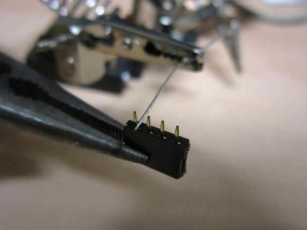 - cada uno a su vez en un tercer lado, agarrar la lata todos los 4 pines así que son fáciles de soldar cosas. Cuando soldar conectores de cualquier tipo es una buena práctica para tenerlos enchufados en el lado opuesto del conector (enchufe o toma de corriente) para aumentar la capacidad de calor y hacen difícil para que usted accidentalmente derretir el plástico. Así que poner algunos encabezados masculinos en los conectores hembra al soldar.