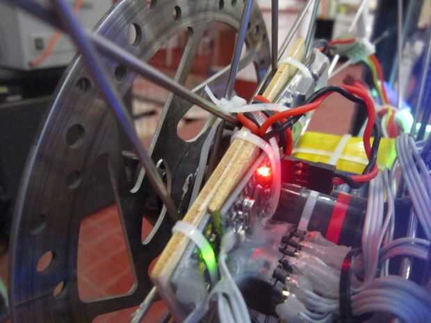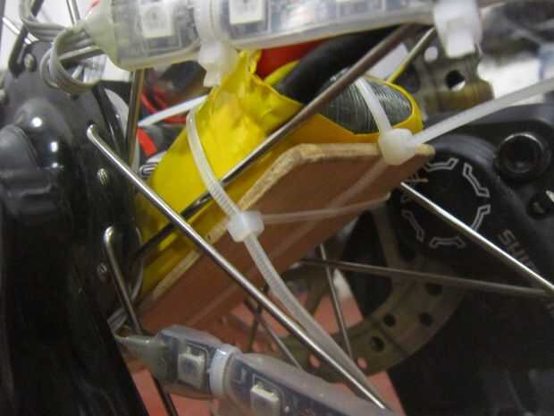 El montaje es todo para ti, yo sólo usé un montón de ataduras de cremallera y pedazos de madera contrachapada de 3 mm para mantenerlo todo junto. El tablero del sensor debe ser instalado aproximadamente perpendicular al eje de la rueda o en la rueda "del disco" plano, pero no necesita alinear exactamente, el software puede cuenta para desalineaciones.