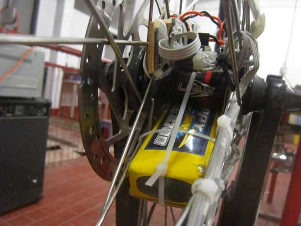 - Evite exprimir la batería LiPo demasiado duro con los lazos del cierre relámpago y asegúrese de que la fuerza centrífuga no apretar o pellizcar con algo una vez que está manejando la bicicleta y la rueda está girando. Estas baterías son frágiles y pueden ser explosivos o incendiarse cuando. Obviamente, la fuerza centrífuga actúa en la dirección lejos del eje de la rueda y es más pequeña cerca del centro. Montar tan cerca del centro y tal vez usar un pedazo de algo plano entre la batería y los lazos zip para maximizar la superficie en la que se aplica la fuerza.