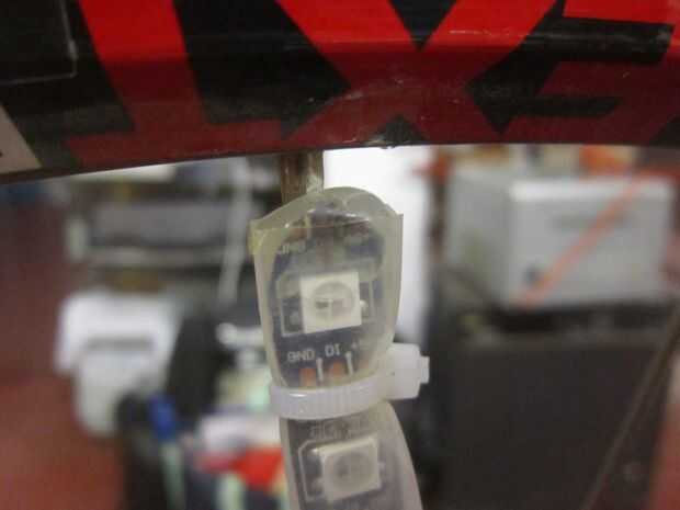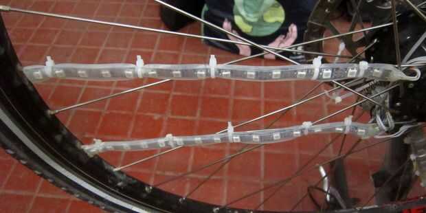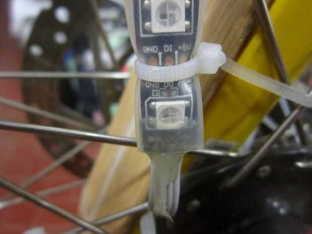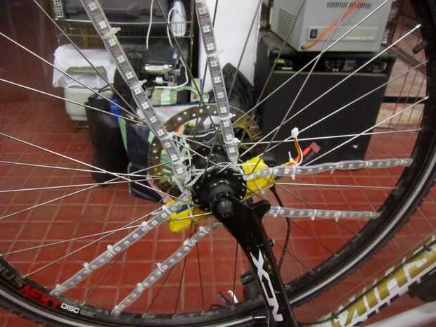 Por último las tiras de LED son sólo zip atado a los rayos, asegúrese de que no resbalan a lo largo de los radios. En mi caso pienso montar las tiras de 6 pares de radios adyacentes en tres lados opuestos de la rueda debido a la simetría en el patrón de habla. Supongo que este patrón de habla es bastante estándar. Tener tiras juntas ayuda a hace POV texto legible a una velocidad baja.