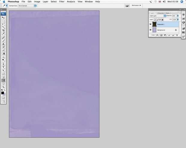 Volver a empezar en el fondo por primera selección R = 184, G = 175, B = 217 como su color de fondo. Crear un nuevo documento de retrato A4 en modo RGB, 300dpi con el contenido de fondo en el Color de fondo. Abrir Distress_1.jpg y Shift + arrastre el icono de la capa a tu nuevo lienzo, etiquetado de la capa 'Polaroid 1'. Ambos archivos comparten el dimensiones en píxeles exactos, así que Shift + registros de perno de arrastre la nueva capa. Ahora establece el modo de fusión a luz suave y bajar la opacidad al 60%.