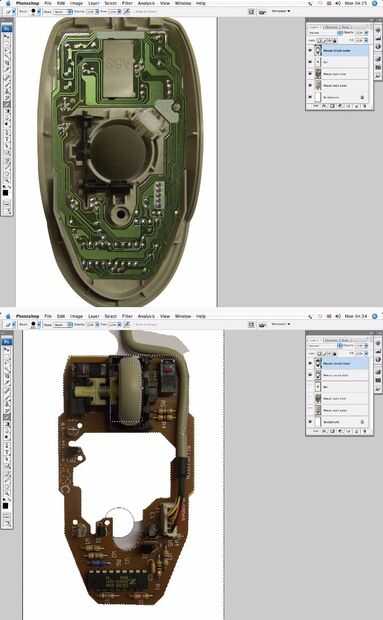 Abrir Mouse_3.jpg, generar una selección de ruta, copia-andpaste en una nueva capa y darle la vuelta (Editar > Transformar > voltear Horizontal). Posición y tamaño y etiqueta 'Circuito exterior del ratón'. Al abrir Mouse_4.jpg, arrastrar y soltar como una nueva capa (no hay ninguna ruta) y etiqueta 'ratón circuito interior. Bajar la opacidad, la posición y escalando sobre su capa anterior. Generar una selección invertida de la capa subyacente, asegurar que su nueva capa está dirigido y borrar sólo las áreas más bajas de interiores y exteriores, no te preocupes el cable todavía.
