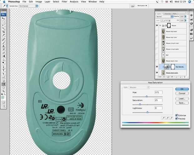 Desactivar la visibilidad de todas las capas pero 'Ratón atrás externo' y una capa de ajuste del clip por holdingAlt/Opt mientras hace clic en el icono 'Crear nuevo relleno de la capa de ajuste' a los pies de la paleta de capas. Seleccione tono/saturación. En el siguiente cuadro de diálogo, marque usar capa anterior para crear máscara de recorte. Conjunto el matiz a 171 y la saturación a 25 con el colorear preestablecido revisado.