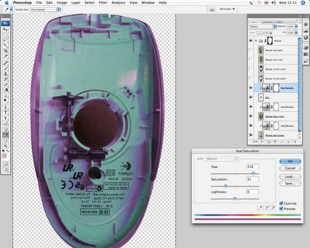 Capa de sistema 'ratón atrás interior' mezcla modo Pin luz; clip de una capa de ajuste Tono/saturación, ajuste el color a 296 y la saturación a 25 con el colorear preestablecida revisado. Lo mismo para la capa de 'Ball' con tono = 318, saturación = 31, pero dejando el modo de fusión sin cambios.