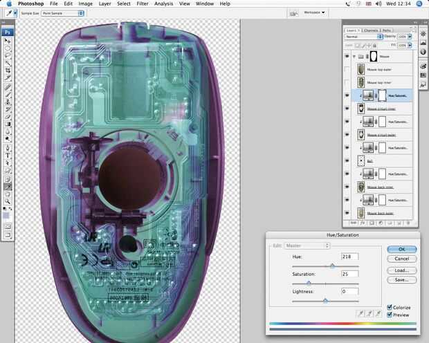 Modo a pantalla de fusión de capa de ajuste el 'ratón circuito exterior'. Clip de una capa de ajuste Tono/saturación, ajuste de matiz = 175, saturación = 25 con el colorear preset comprobado. Establecer 'ratón circuito interno' mezcla modo a luz suave. Clip de una capa de ajuste Tono/saturación con Hue = 218, saturación = 25, con el colorear preset comprobado.