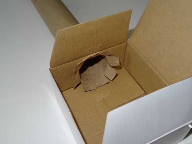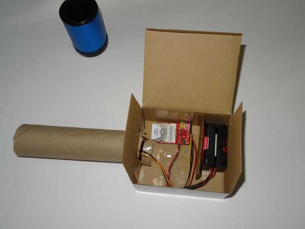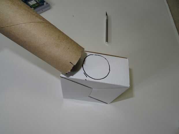 Utilice el tubo de cartón como plantilla y corte un orificio para en el lado de caja de recinto. Tabbify el borde del tubo y su cinta favorita para asegurar el tubo a la caja. El tubo se utiliza para reducir el ángulo de detección del sensor. Por defecto detectará un cono muy amplio de unos 100 grados. El tubo golpea abajo para que el sistema sólo se activa cuando las garrapata o tratadores a pie directamente delante de ella.
