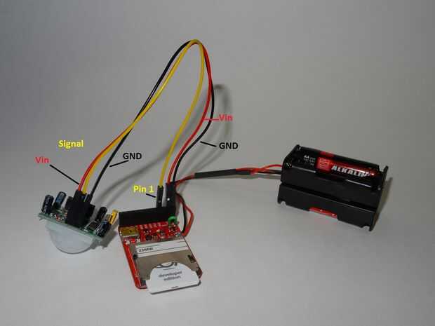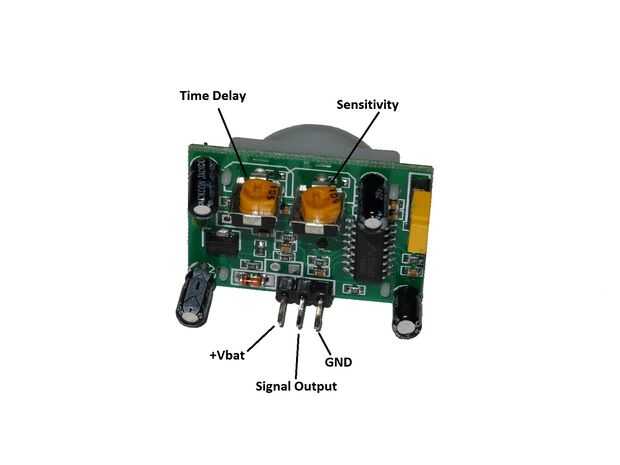 El sensor puede requerir el ajuste para obtener el disparo apenas a la derecha. Ajusté el retraso de tiempo unos 7 segundos y la sensibilidad al mínimo. La imagen que se muestra arriba tiene los potenciómetros como les necesitaba. Esto reduce disparadores al azar. Con un retraso de tiempo de 7 segundos, escuchará sonidos múltiples cada vez que el dispositivo se activa debido a la pastilla la interrogación intervalo siendo unos 2 segundos.