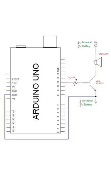 Un pin en el Arduino es oscilante (encender y apagar) creando así un sonido con una frecuencia particular. La señal de este pin está conectada a la base del transistor BD135 que es alimentado por una batería de 9V. La amplificación es del orden de 10-20 (500mA X 9V vs 50mA X 5V) pero para la batería de repuesto y obtener un volumen agradable el circuito funciona mejor con una resistencia variable de 10 K en la base del BD 135.