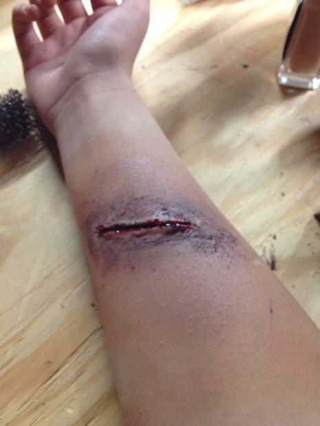 Usar pincel para añadir sangre falsa en corte. Es aceptable si sale un poco.