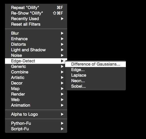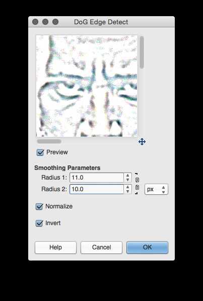 Ahora vaya al menú "Filtros > detectar bordes" como en la 2 º imagen y seleccione "Diferencia de Gaussianas" en el menú que aparece. Obtendrá el cuadro de diálogo en la imagen 3, supra; cambiar la configuración en ese diálogo para que coincida con la configuración en esa foto. Crea una interesante versión de contraste de la imagen original. Haga clic en "Aceptar" y la ventana del proyecto reflejará los cambios.
