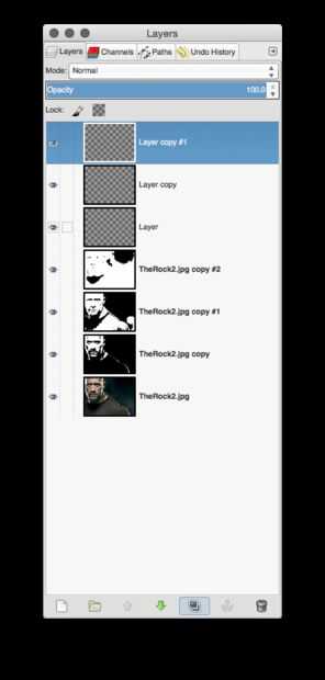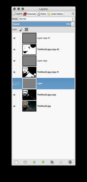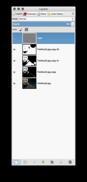 Ahora viene la parte moderadamente difícil: Quiero que arrastre las capas vacías en la ventana de capas para que tenga una capa vacía encima de cada capa de umbral, como en la imagen 4, arriba. Todo lo que tienes que hacer es haga clic en y mantenga presionado una de las capas vacías y fricción es hacia abajo en la pila en el lugar que quieras que sea.