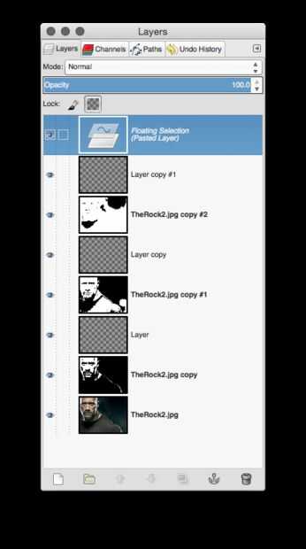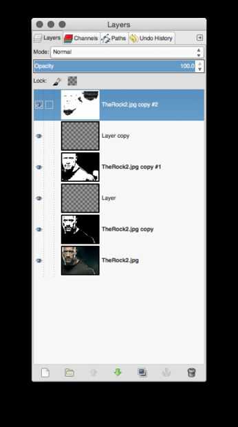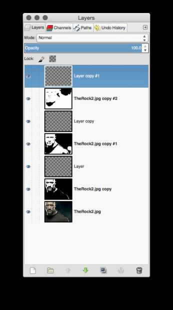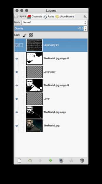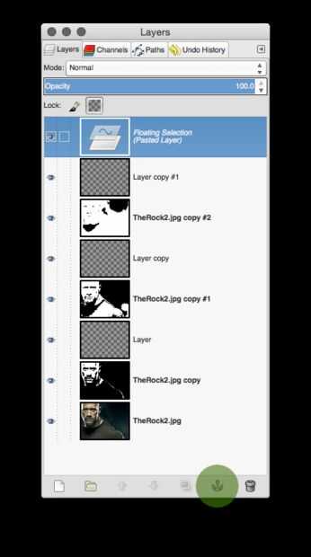 Una vez usted ha seleccionado las texturas que desea utilizar, copiar la que desea aplicar a lo DARKEST de tus capas de umbral (el que está con 25% de cobertura) en el portapapeles y luego regresa a la imagen del proyecto. Seleccione la capa vacía encima de la capa umbral más oscura haciendo clic en él (como en la primera imagen, arriba) y luego pegar la textura grunge en la imagen, entonces se obtendrá una nueva "capa flotante" como en la segunda imagen, por encima de. Usted notará en la esquina inferior derecha de la ventana de capas que hay un icono de anclaje (ver tercera imagen, anteriormente, en el punto verde). Haga clic en ese icono, y la "capa flotante" se pegue en la capa había seleccionado sólo un segundo atrás. Las capas no deberían verse como la cuarta imagen, arriba.