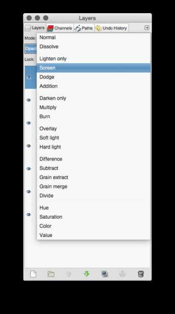 Lo que queremos hacer aquí es forzar a la textura en la nueva capa en la capa que tiene la imagen de umbral, y que vamos a utilizar una técnica llamada "proyección". Seleccione la capa con la textura en él haciendo clic en él y mirar a la parte superior de la ventana de capas. Usted verá un menú desplegable que dice "Normal." Si usted haga clic en el menú caerá hacia abajo como en la imagen 5, arriba, y verás una opción dice "pantalla". Haga clic en esa opción, y de repente cambia su imagen en la ventana de visualización principal: la textura será blanco por todas partes la capa de debajo es blanco, y mantendrá su textura en todas partes que la capa es de color negro.
