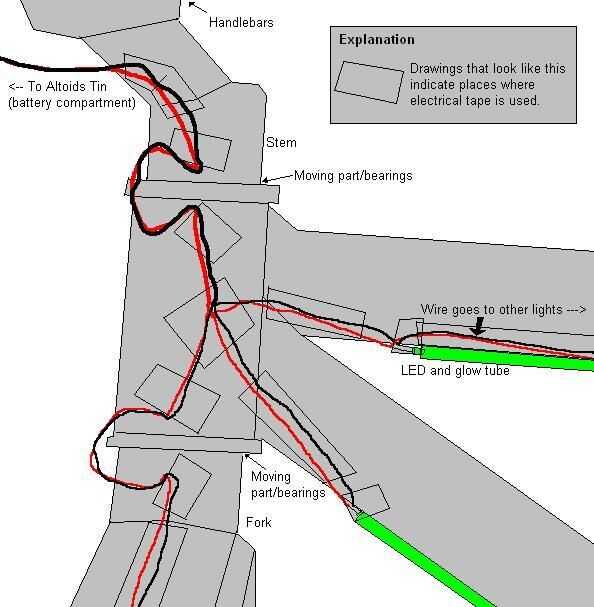 Utilice cinta aislante de buena calidad, resistente a la intemperie para asegurar los cables a su bicicleta. Cinta negra funciona muy bien para mí porque mi moto es casi negro.
