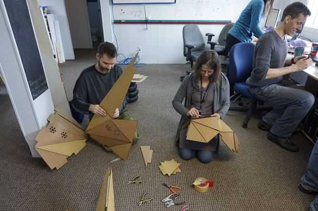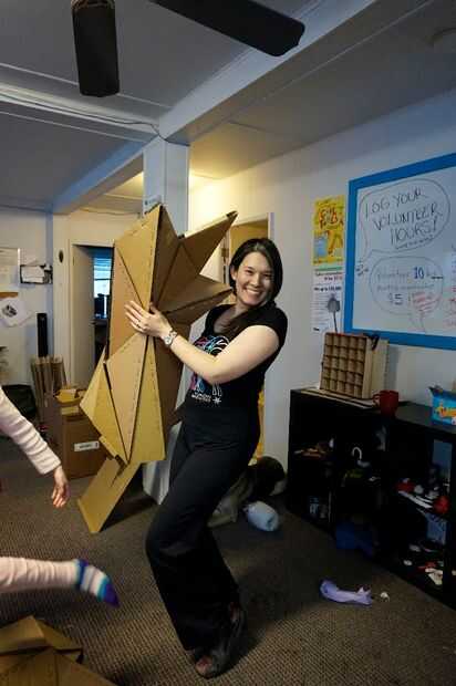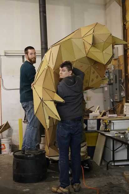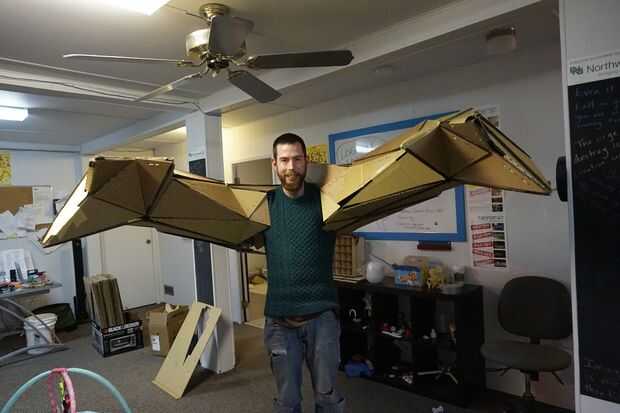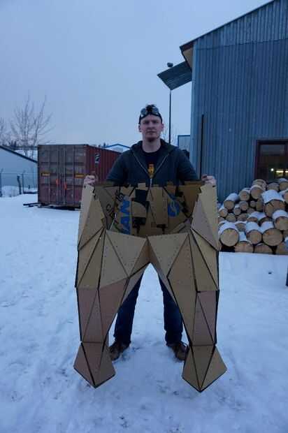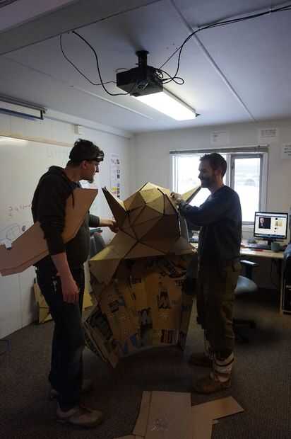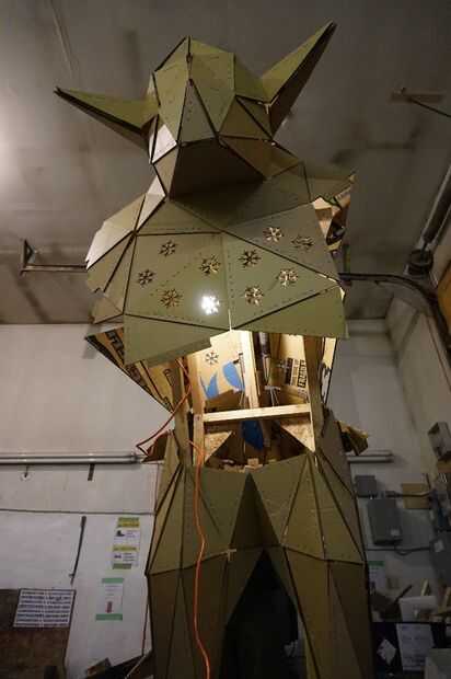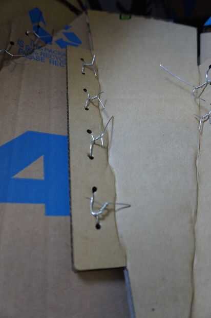 El cartón fue montado en secciones y luego fijado a la estructura esquelética con más alambre, tornillos y fleje de metal.