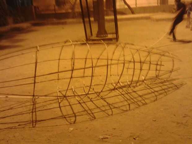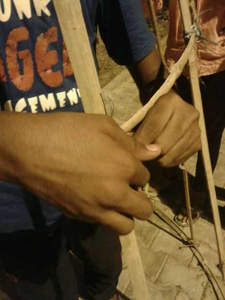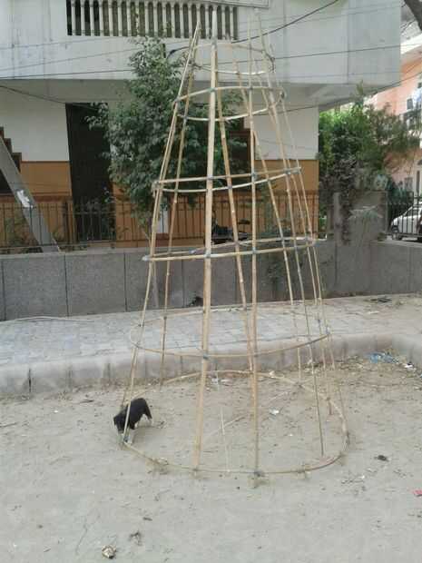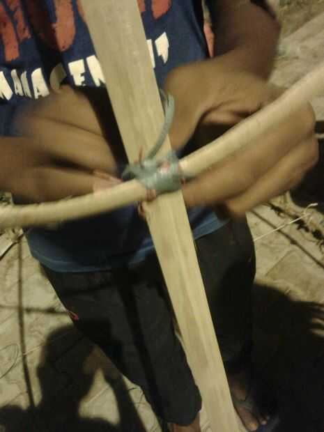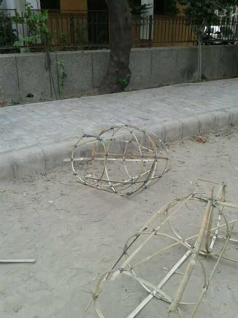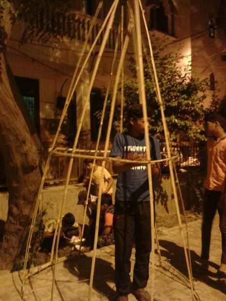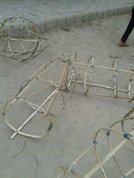 esta es una de las más importantes y el paso de comenzar a tomar más tiempo de todo el proyecto (Tomo 28 personas aproximadamente 2 semanas) para hacer el esqueleto de un material muy flexible y resistente era necesario así tomamos bambú y luego para atar un montón de nylon tira (279 m) .en primer lugar se realizaron 2 anillos y luego las tiras de bambú largo de lotes fueron utilizadas más adelante muchos anillos fueron insertados (lo siento las imagenes no están en orden) después de cada lo que se llevó a cabo en su lugar con tiras de nylon y el uso de thr teqnique mismo se hicieron las manos, la parte inferior y la parte superior. el objetivo principal era hacer un esqueleto muy fuerte o un soporte (como el peso era de unos 256 kg) .once taco hecho tuvimos que cubrirla.