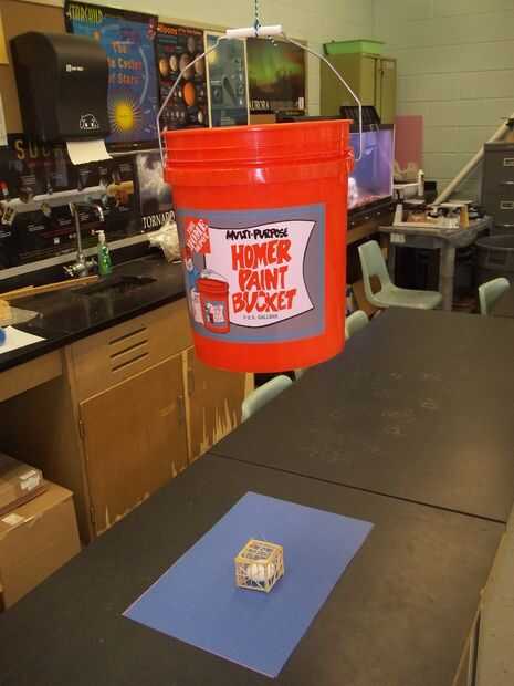 1. Coloque el artilugio de huevo debajo de un cubo de 5 galones con una masa determinada (yo uso 2 libros de texto en el cubo).
