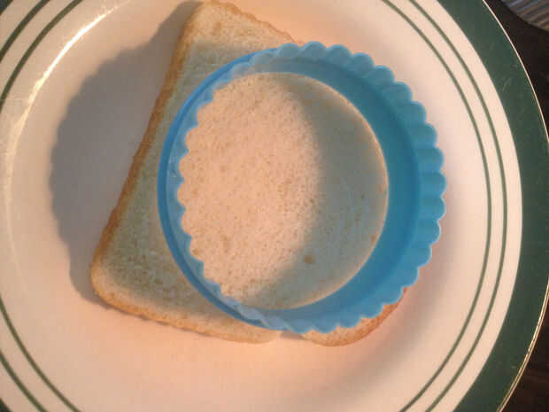 Corte redondo un pan con cortador de galletas o un vaso con borde ancho y en el fondo de un molde o un recipiente o un cupcake grande del molde como se muestra