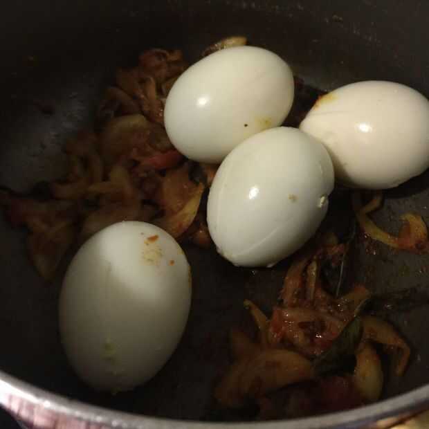 Añadir los huevos al masala y mezclar suavemente hasta que los huevos bien con las especias.
