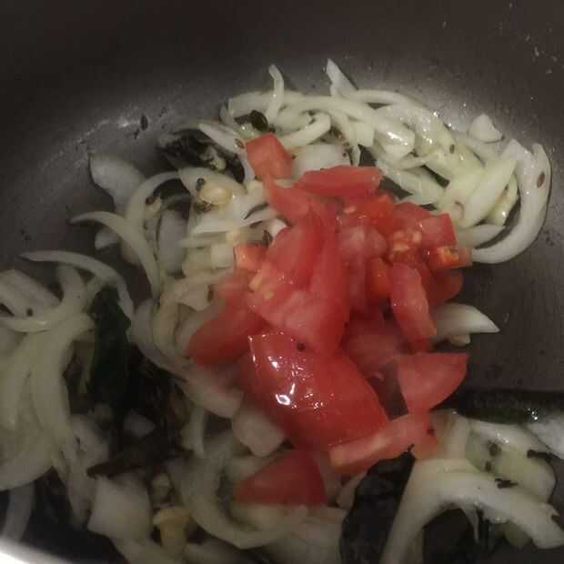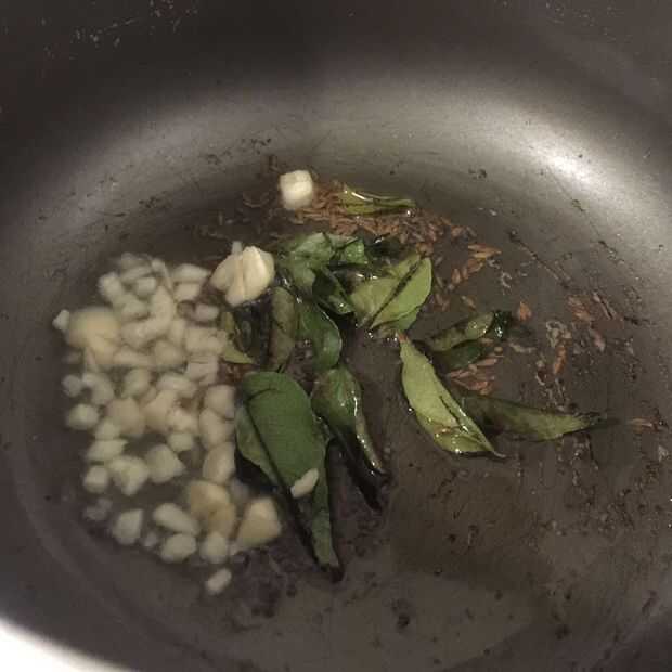 Añadir las semillas de mostaza, semillas de comino, ajo y hojas de curry en el aceite caliente. Saltear durante 30 segundos.