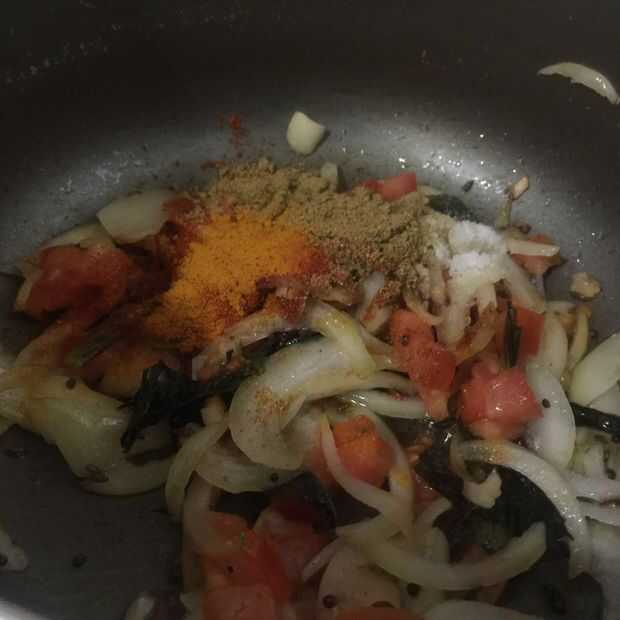 Ahora agregue los polvos de especias y sal. Mezcla todo bien, reducir la llama baja y sofría hasta que desaparece el raws olores de las especias.