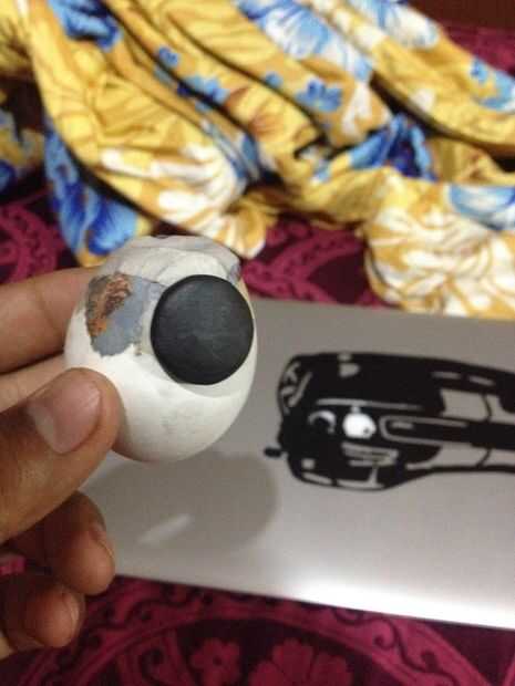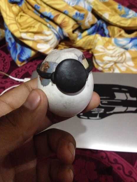 La criatura fue empedrada de una vieja cabeza de ducha, accesorios sin uso de una chimenea de gas, la parte superior de una caja de Eddie Bauer Watch, algunos cables y algunos el tubo del encogimiento. Los brazos y las manos están hechas de alambre y