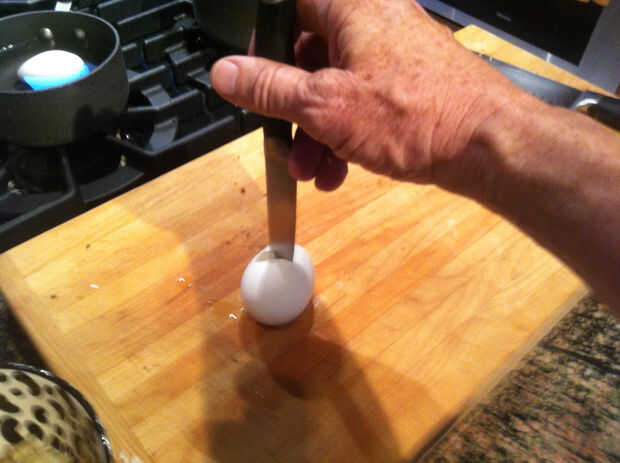 Apuñala los huevos en el centro y corte en mitades. Esto generalmente recompensa a alguien con un buen trozo de cáscara de huevo que ya no detecta mi vista falla. Ley de Murphy dicta que no me dé la cáscara.