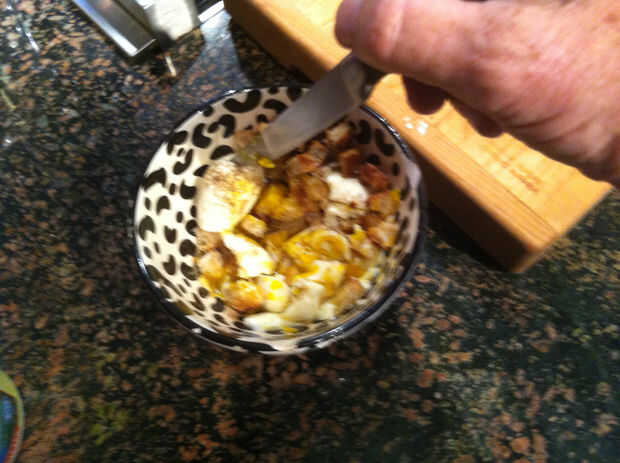 Sal y pimienta a tu gusto y luego use el cuchillo punzante para picar los huevos en trozos... servir y disfrutar.