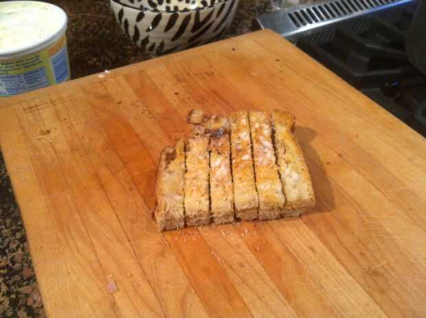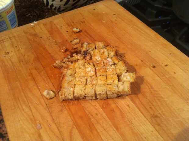 Apilar las dos mitades... Cortar en tiras de media pulgada; Cruz rebanada en cuadrados de media pulgada.