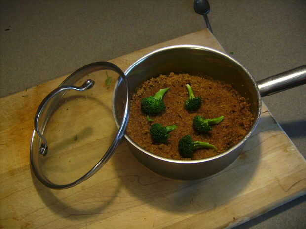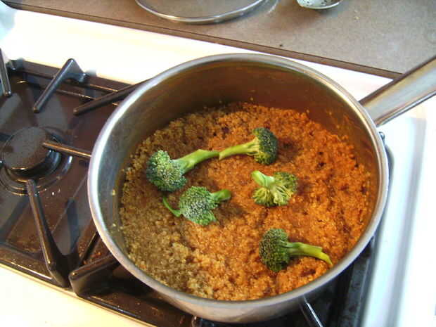 Luego cocinar la quinua. El paquete que tengo llamadas para 1,5 tazas de agua. Poner a hervir, añadir la quinua, ponerla a hervir, tapa y cocinar en baja por 10 a 14 minutos. Cuando esté casi hecho añado unos trozos de brócoli a la cazuela tapada para que le de vapor a cook mientras estoy trabajando en el resto de la comida.