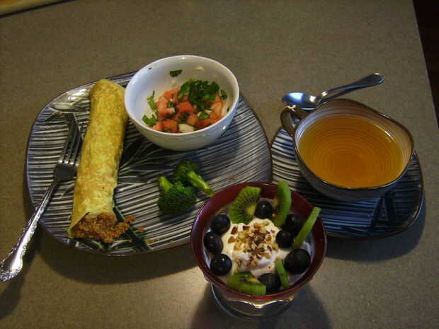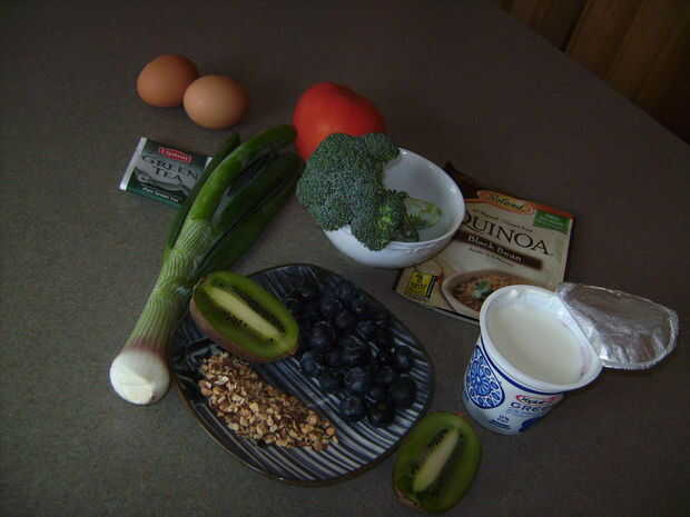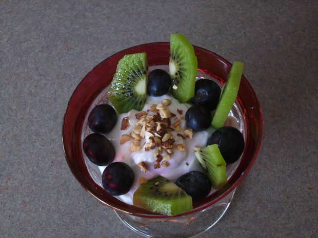 Para desierto usted necesita agregar 1/2 taza de yogurt natural, arándanos de 8-10, 5-6 rodajas de kiwi y 1 cucharadita de almendras tostadas.