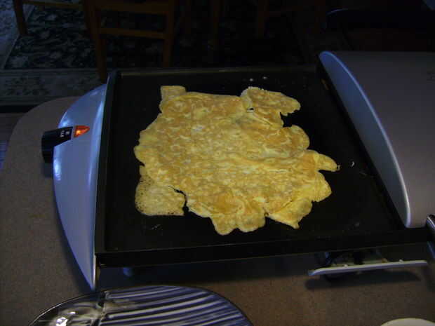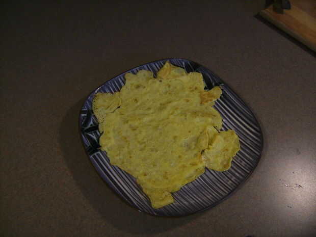 Una capa ligera de la superficie con aceite de oliva y vierta cuidadosamente el huevo para hacer una forma plana grande. Después de aproximadamente 1 minuto Dale la vuelta y cocinar ligeramente en el otro lado. Quite y ponga en su plato.