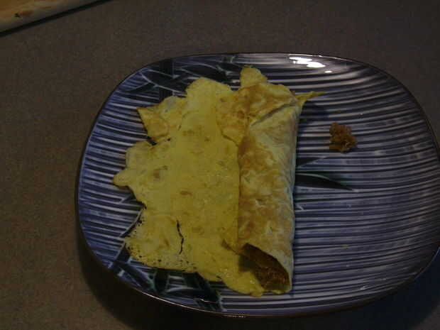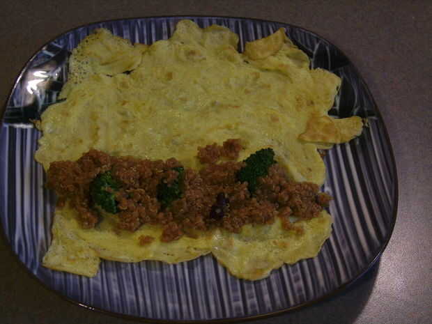 Cuidadosamente Vierta en la mezcla de brócoli en una línea a lo largo de la parte inferior de la envoltura del huevo, quinua y haba. Cuidadosamente empezar a rodarla para arriba y dejar la costura en la parte inferior. Tengo hambre. Vamos a comer.