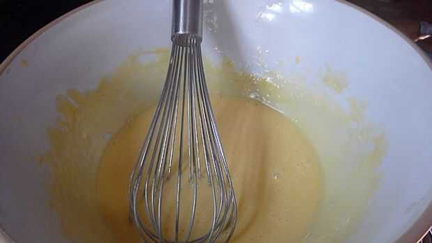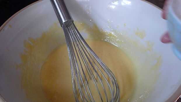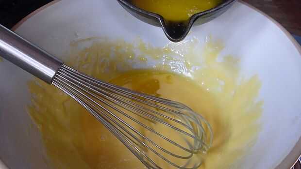 una vez que las yemas han espesado es hora de añadir la mantequilla derretida, esto debe hacerse poco a poco y batiendo constantemente. Esto es potencialmente uno de los puntos más fáciles meterse, por ejemplo si los huevos se calienta demasiado se empiezan a cocinar y necesita rápidamente quitar el calor y en algún lugar frío.