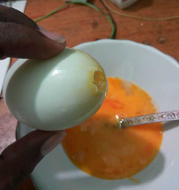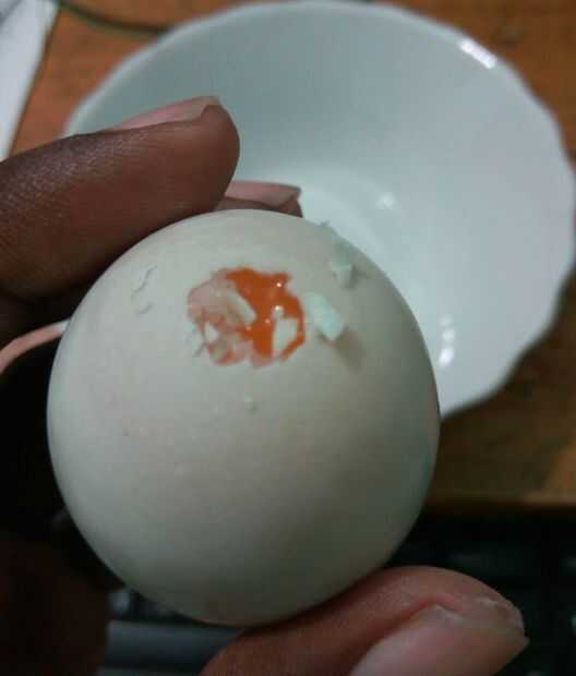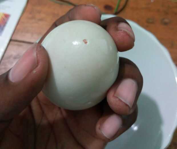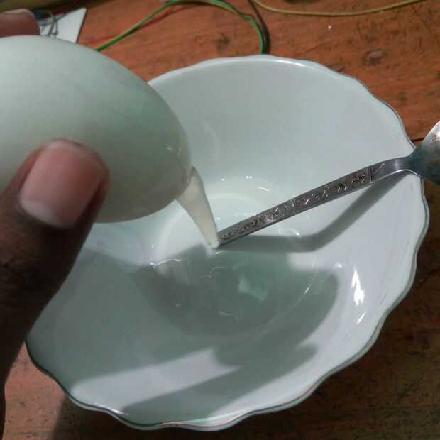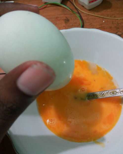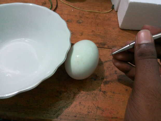 Lavar los huevos con agua y jabón. Con el pasador, haga un orificio en la parte superior del huevo. Ser suave. No quiero romper el huevo. Cuidadosamente le agrande el orificio alrededor de 1 cm de diámetro. Ahora escurrir las claras y yema de huevo y verter a un recipiente pequeño. Esto puede ser un poco difícil. Puede que necesite un poco el huevo y pinchar la yema para obtener todo, puede utilizar el mango de una cuchara para hacer el trabajo fácilmente. Repetir este proceso con todos los huevos y enjuague bien los huevos.