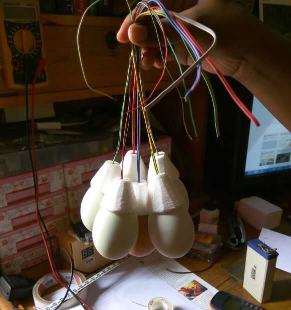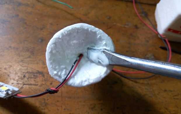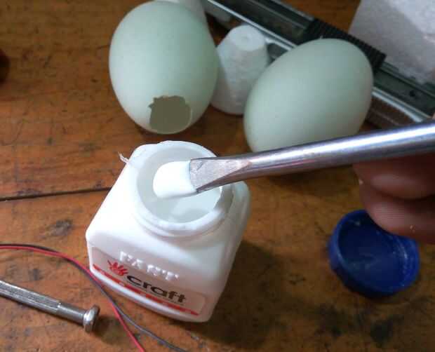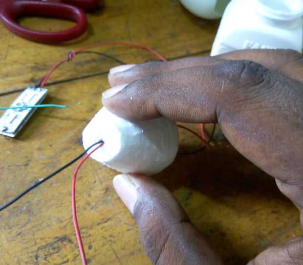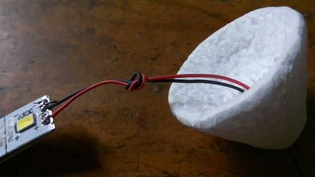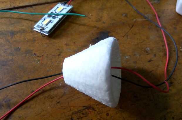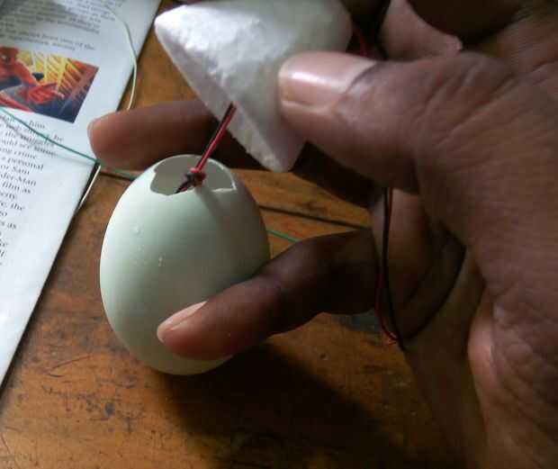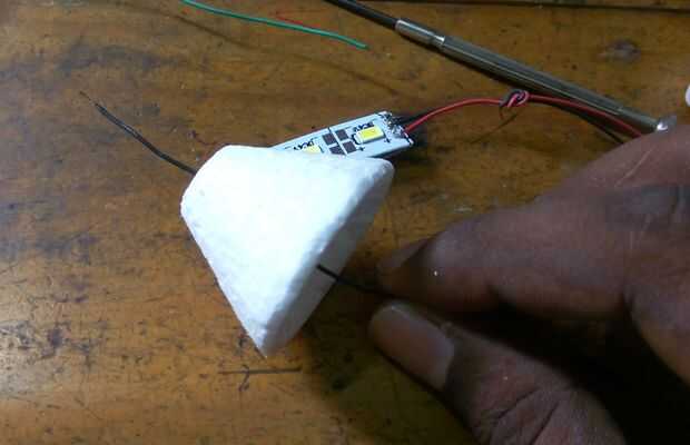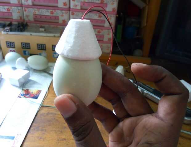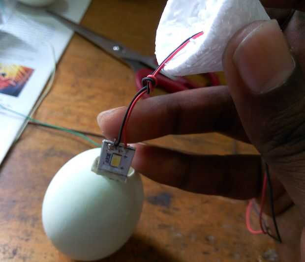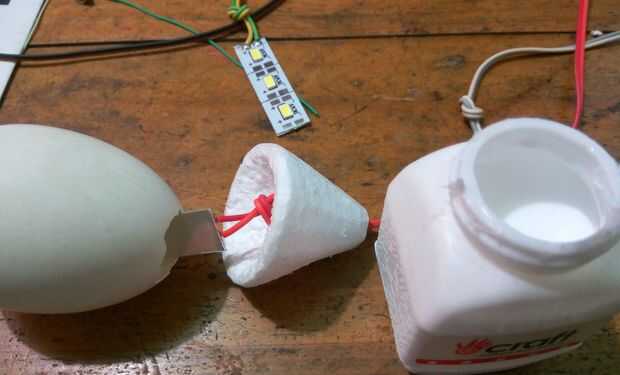 Saca los cables de luz hecho antes a través del agujero del cono. Mantener el LED al lado más ancho del cono. Utilice pegamento resina adhesivo o arte y fijar el cono de espuma a la cáscara de huevo teniendo la tira de LED en la cáscara de huevo como se muestra en las imágenes. Su luz de huevo está listo ahora.