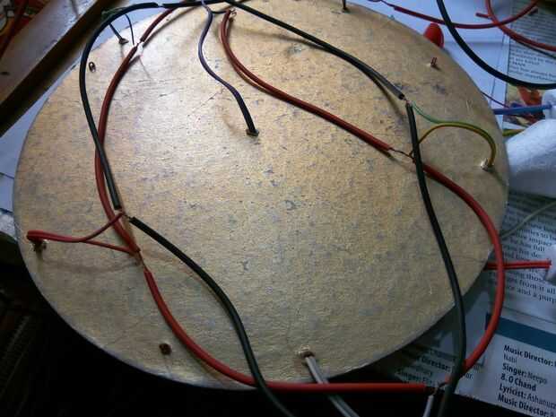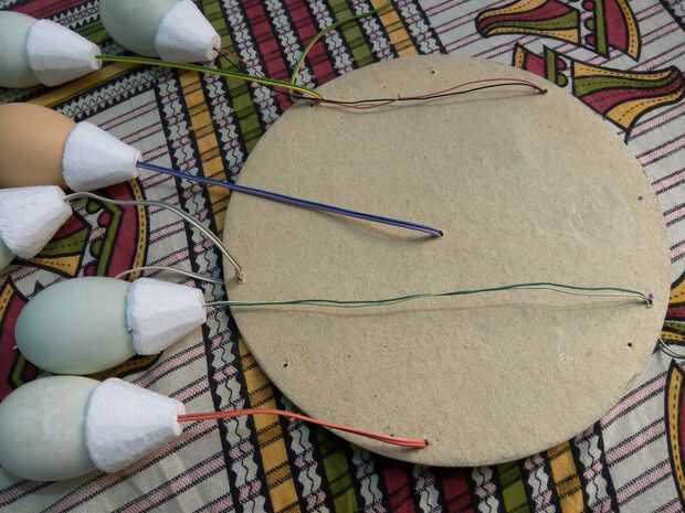 Tomar una carta redonda y hacer algún agujero en igual distancia para colgar las luces del huevo. Se puede colgar uno marrón en el centro del tablero. En lugar de utilizar la tarjeta puede usar anillo circular para colgar las luces del huevo. Depende de su propia elección. Entonces conectan los cables positivos de todas las luces. Lo mismo para los cables negativos. Debe utilizar cinta aislante para proteger las luces de cortocircuito accidental.