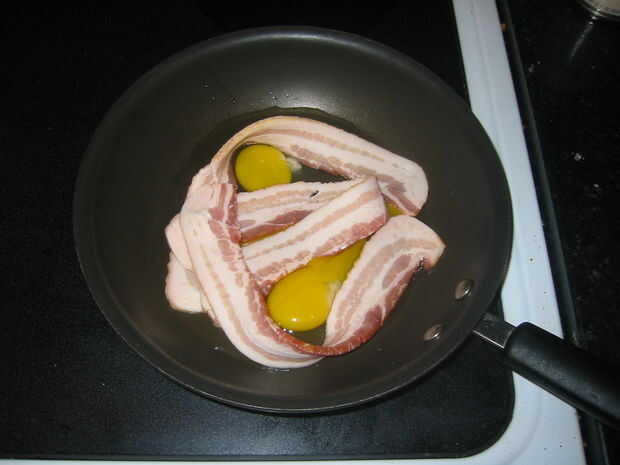 Poner la cacerola en la estufa. Al mismo tiempo añadir los huevos a la sartén. Luego agregar el tocino en cualquier patrón que se le parezca. Trato de envolver alrededor de las yemas.