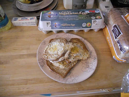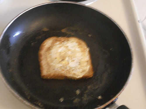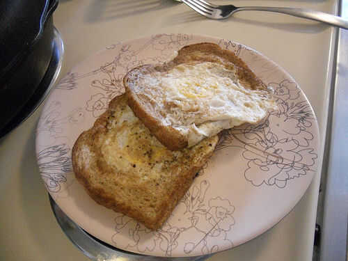 Dar su huevo otro tirón para comprobar. Todos los blancos deben fijarse y el pan debe ser dorado. Levante sobre la placa y volver a la estufa para calentar para no quemar la mantequilla para la rebanada siguiente. Gire hacia atrás hasta medio cuando se agrega el pan. Repita hasta que todo el mundo tiene dos deliciosas rebanadas.