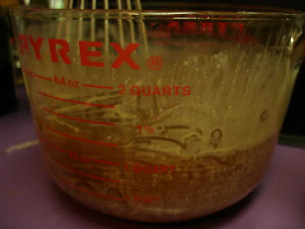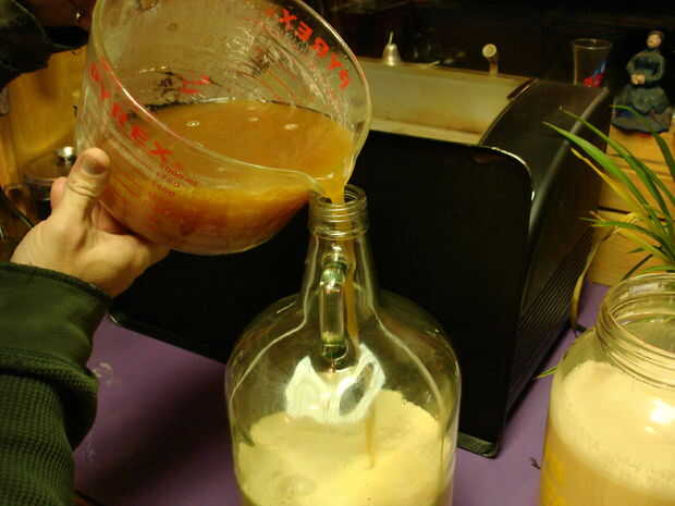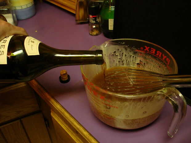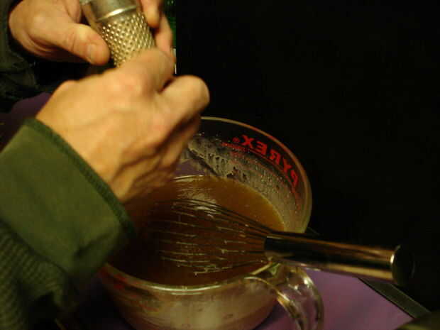Poner el alcohol en el tazón. La rutina en la mitad una nuez moscada, añadir una pizca de canela y una pizca de cardamomo. Mezclar y verter en la jarra que reservar antes.