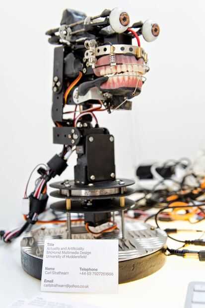 El título de mi último año proyecto de diseño de Multimedia (actualidad y artificialidad) es una adaptación de la modernista ideología del filósofo Jean Baudrillard, simulación y simulacros: simulacro como objeto y la simulación como proceso. El robot puede rastrear el movimiento y responder a preguntas a través de un teclado inalámbrico, sin embargo, reconocimiento de voz puede implementarse mediante la función de dictado y el discurso de Mac en preferencias del sistema en puestos via micro quad interno del xbox kinect configurar. El robot utiliza una versión adaptada del marco algorítmico Eliza (derivado de siri) para responder a preguntas de participantes, el 'script' entonces se hacia fuera-pone modulador de voz de scripts de apple por lo que puede oírse a través del sistema del altavoz interno de robots. La aplicación del proyecto es como una exposición interactiva, pero este proyecto es altamente adaptable y sería ideal para exhibiciones de Museo, help desk o teatro interactivo. El marco de Eliza se puede cambiar para imitar a cualquier persona o lenguaje (actualmente basado en Marvin de guía de los autostopistas a la galaxia) y también responder a preguntas complejas, haciendo de este un sistema altamente interactivo y experimentado. La voz puede outputted y modelada de personas concretas y la boca y los labios reaccionan con el sonido que llega a salida de audio del ordenador por lo que es siempre más o menos en el tiempo. El sistema de pistas de movimiento de pueblos a través de un módulo de Kinect, el sistema actual utiliza una biblioteca de software abierto que rastrea el píxel más cercano al sensor, sin embargo, el guión también incluye salida de seguimiento de esqueleto que puede ser activado vía sin comentar el esqueleto de código y comentando el punto de biblioteca. Esto significa que varios individuos pueden ser rastreados e interactuaron con a la vez, para un público más amplio.