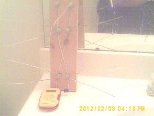 Cruza los dos alambres rectos hacia el lado opuesto de la madera. Deslice los cables debajo de las arandelas del segundo y el tercer conjunto de tornillos de la parte superior. Deslizar una varilla en forma de "V" debajo de cada lavadora. Apriete los tornillos, manteniendo el extremo abierto de la barra en forma de "V" mirando recto hacia fuera de la madera.